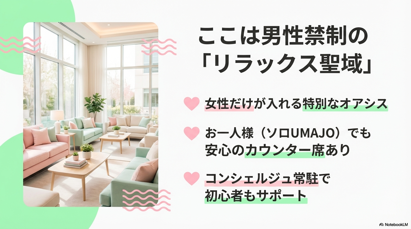 このスポットの最大の特徴であり、最大のメリットとも言えるのが、「男性禁制」という点です。未就学の男の子であればお母さんと一緒に同伴可能ですが、基本的には大人の男性は入ることができません。競馬場はどうしても男性比率が高い場所なので、女性だけで完全にリラックスできるこの空間は、まさに「砂漠のオアシス」のような存在。人目を気にせず、お友達とレース結果に一喜一憂したり、自撮りを楽しんだりできるのは、女性ならではの特権ですね。