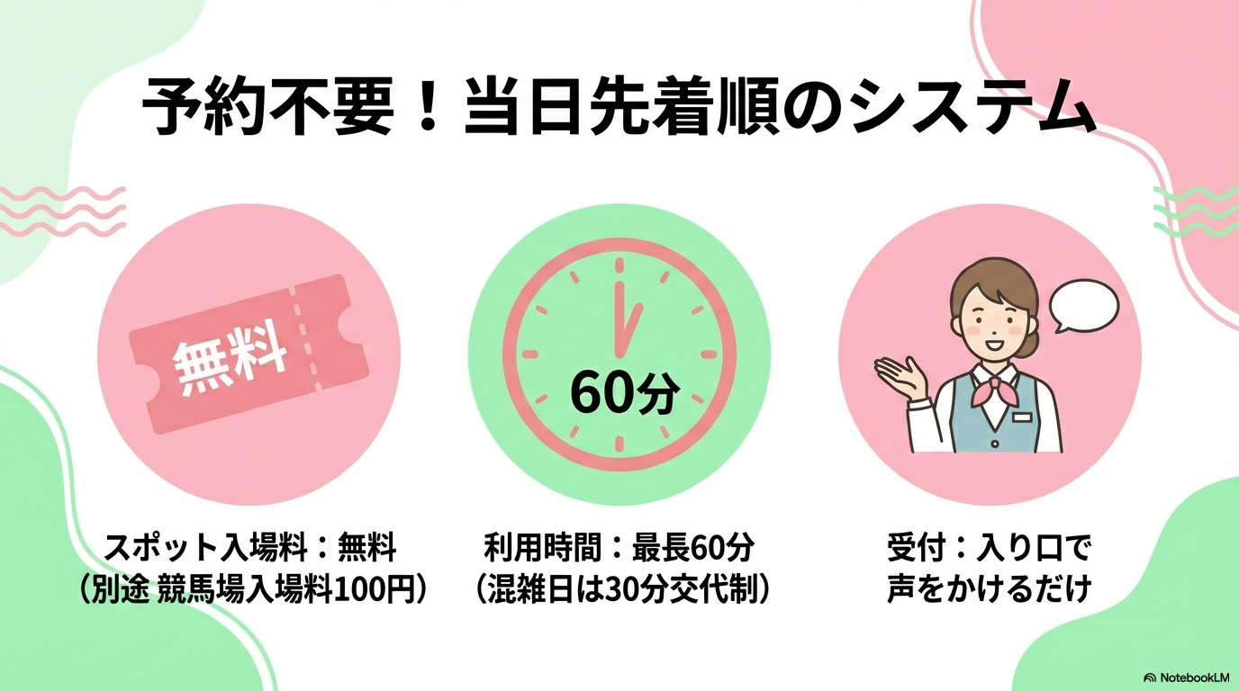 小倉競馬場のumajoスポットを楽しむために、まず知っておかなければならないのが、その「入場の仕組み」です。最近の競馬場は、指定席や入場券を「指定席・入場券ネット予約」で事前に確保するのが主流になっていますが、このスポットに関しては「完全当日先着順」での受付となっています。事前のネット予約や電話予約のシステムは一切存在しないため、「今日は絶対にあの限定スイーツを食べたい!」と思ったら、開門直後を目指して早めに足を運ぶのが、私個人としても一番確実な方法かなと思います。