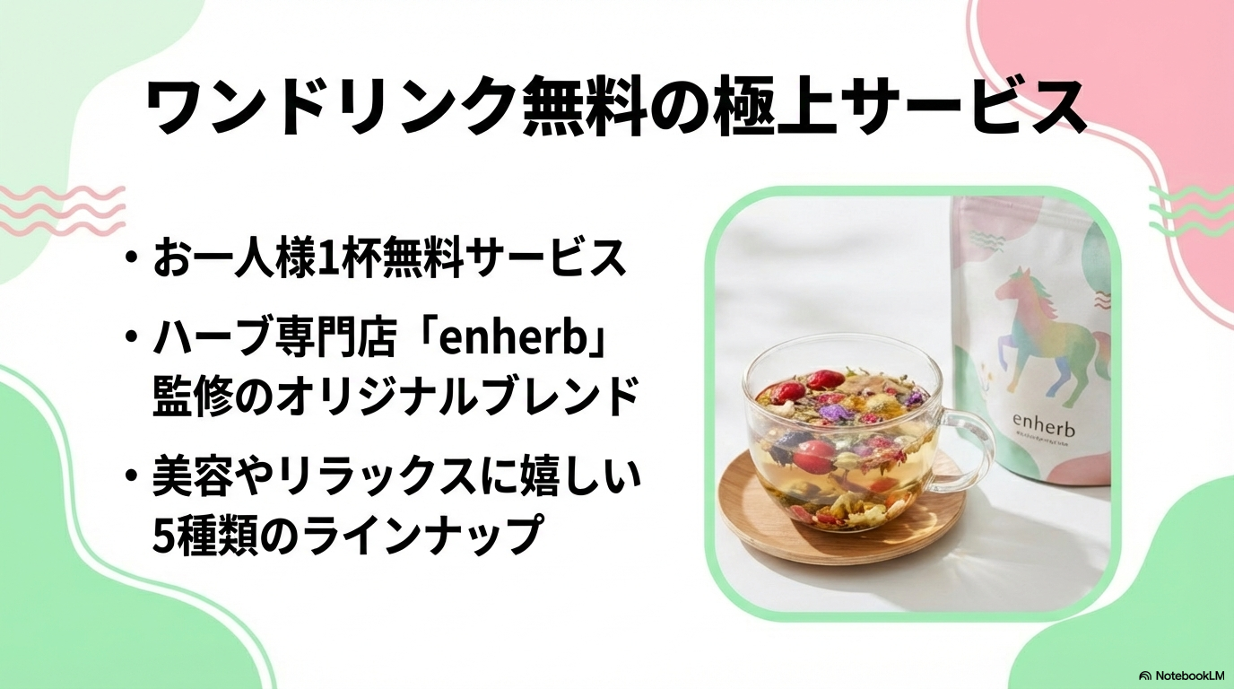| 無料ドリンク | 女性1人1杯まで | enherbの本格ハーブティーが無料! |