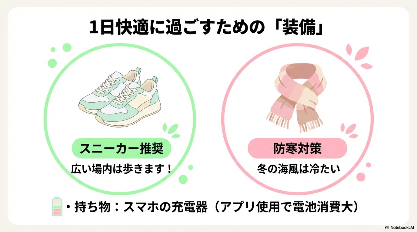 - 靴の選択:スニーカーやフラットシューズがベスト。ヒールやサンダルはイベント参加不可のリスクあり。