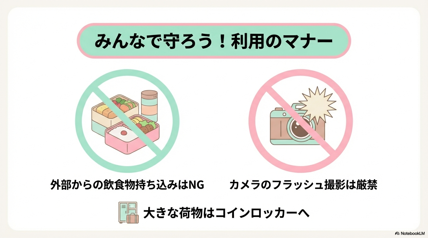 スポットを快適に使うためには、いくつか独自のルールがあります。まず、最も間違えやすいのが飲食物の扱いです。「外部からの飲食物の持ち込みは原則禁止」となっています。場内のフードコートで購入したお弁当や、外で買ったコーヒーを飲みながら……というのはNGなんです。スポット内で提供される無料のハーブティーや、そこでしか買えない限定スイーツを純粋に楽しむ場所、と覚えておくといいかなと思います。