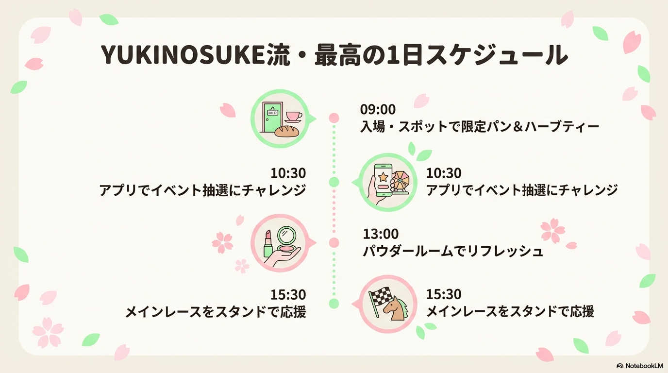 私の理想的なスケジュールとしては、まず9時過ぎに入場してスポットへ。まだ静かな空間で無料のオリジナルハーブティーを注文し、コンシェルジュの方に今日のメインレースや注目馬について軽くお喋りしながら、落ち着いて予想を組み立てます。10時を過ぎて第1レースのファンファーレが鳴る頃には、手元に美味しいスイーツを確保できている状態ですね。お昼を過ぎて15時近くになると、メインレースに向けて場内の熱気は最高潮に達し、スポットも満席になることが多いため、午前中のうちにリラックスタイムを満喫しておくのが、混雑に巻き込まれずに楽しむコツですよ。