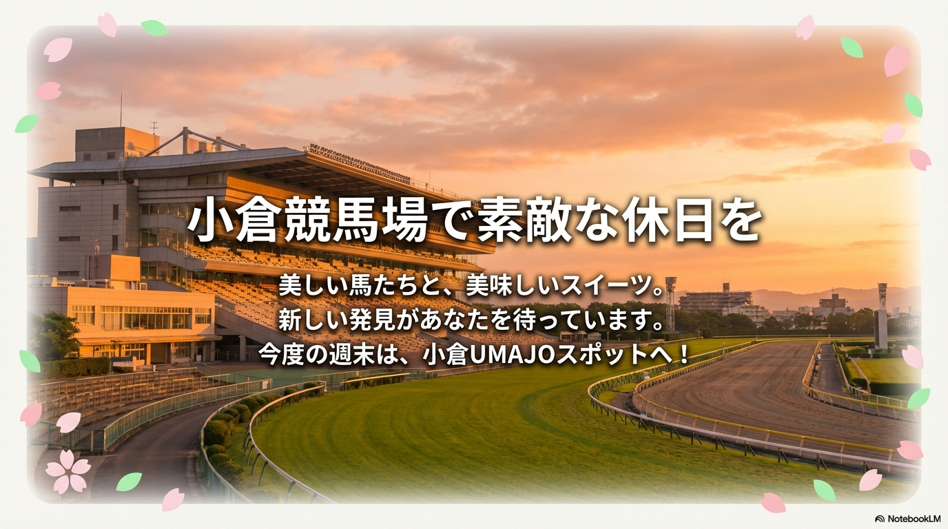 最後に一言、お伝えさせてください。競馬場は、馬という美しい生き物を愛するすべての人に開かれた、情熱と癒やしが同居する場所です。小倉競馬場のumajoスポットを起点に、パドックで馬の瞳の輝きに癒やされたり、ゴール前の歓声に身を任せて高揚感を味わったり……。自分なりの「UMAJOスタイル」を見つけていく過程こそが、競馬というレジャーの本当の醍醐味なんじゃないかなと私は思います。福岡限定のチロリアンをお土産に買って、夜は小倉の美味しいご飯を堪能する。そんな完璧な休日が、ここには待っています。この記事をきっかけに、小倉競馬場に足を運んでくれる方が一人でも増えたら嬉しいです。それでは、最高の競馬ライフを楽しみましょう!