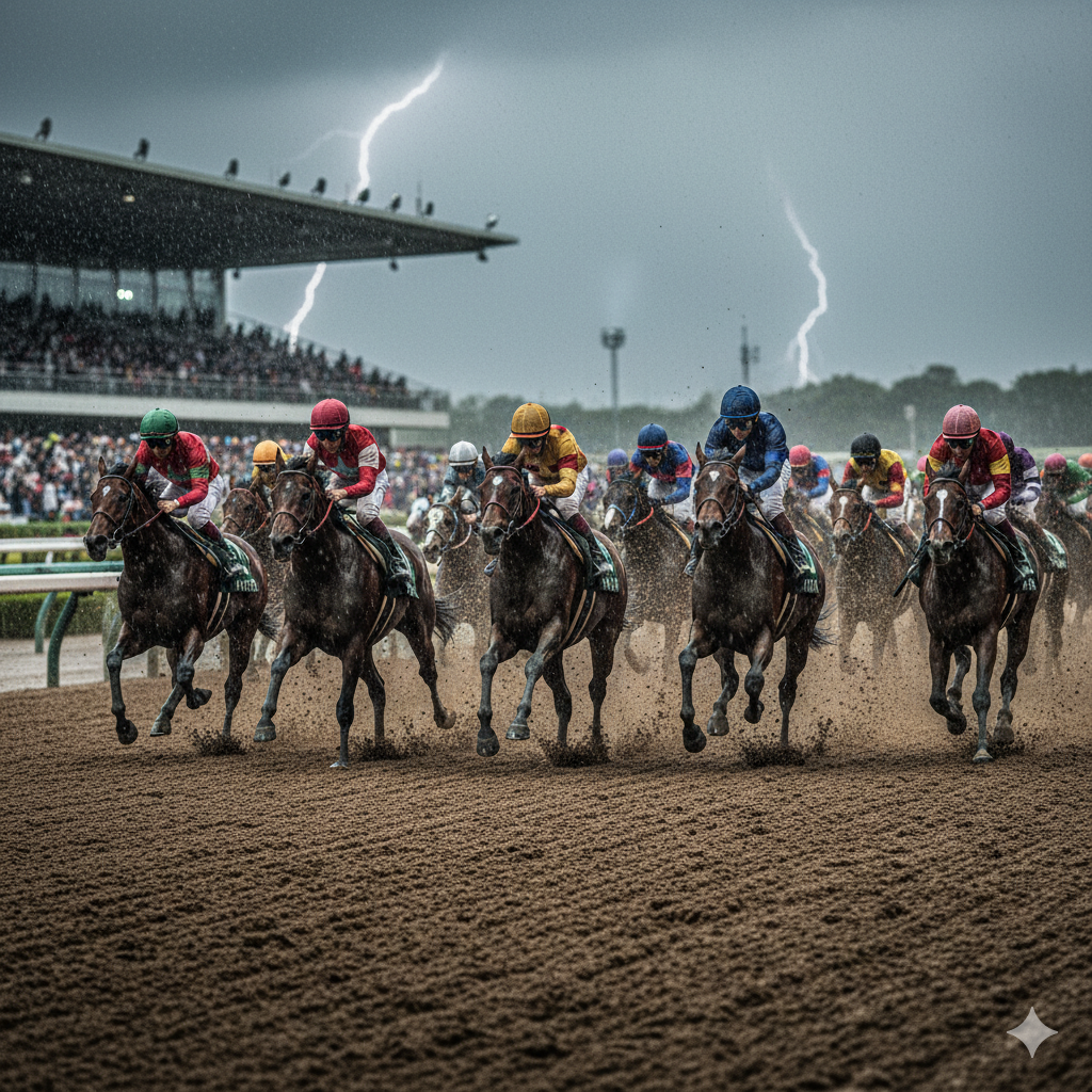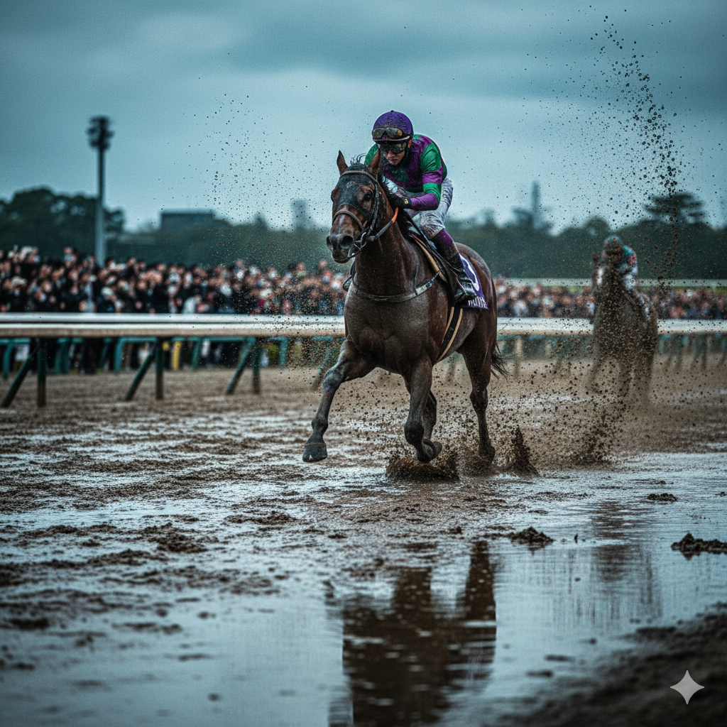 まず第一に、このレコードが記録された日の馬場状態は「重馬場」でした。ダートコースは、良馬場(乾燥)の状態が最も時計がかかります。なぜなら、馬の脚が乾いた砂に深く潜り込み、大きなパワー(キック力)を必要とするためです。