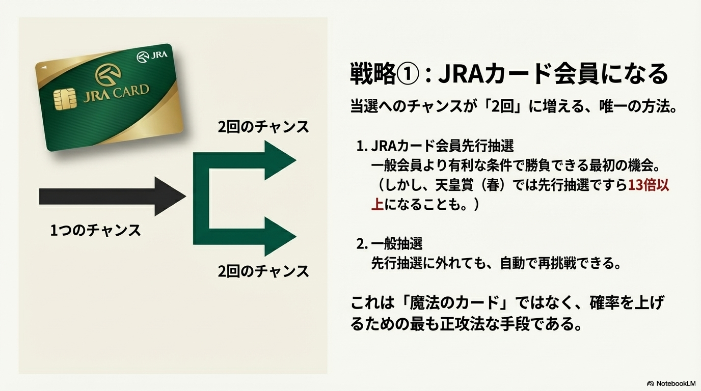- 抽選の当選確率を上げる最も有効かつ現実的な方法は、JRAカード会員になること