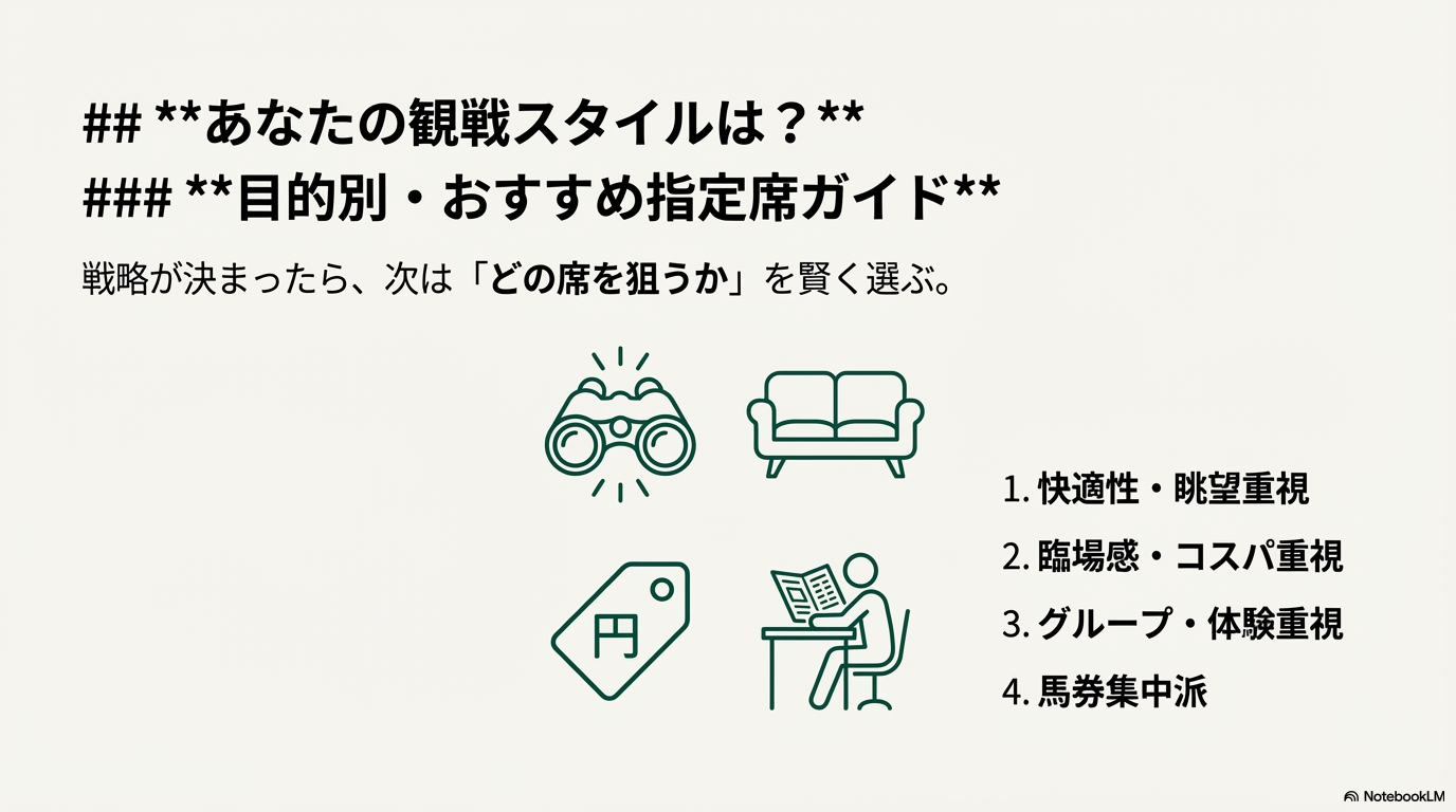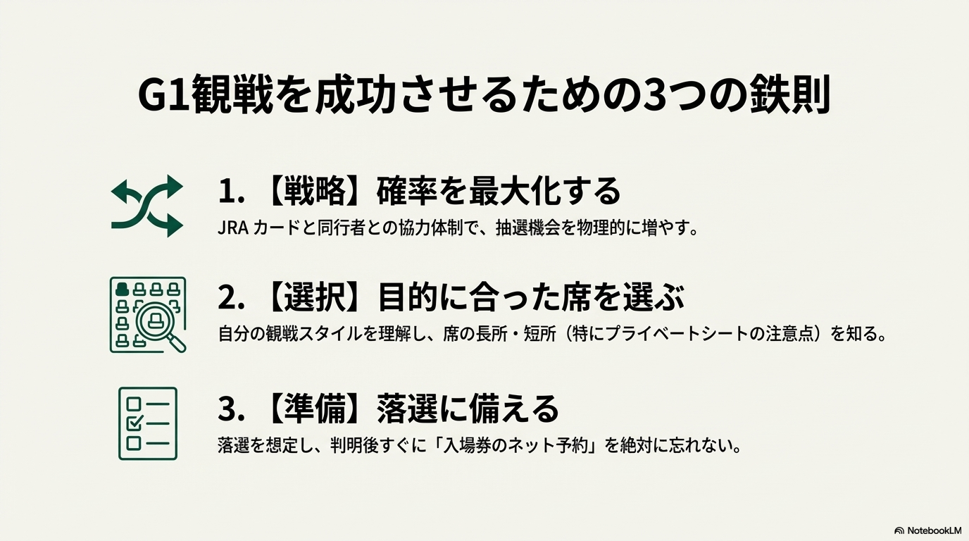 最後に、この記事で解説してきた「京都競馬場 指定席 倍率」に関する重要なポイントを、G1観戦を目指す方のために要点としてまとめます。観戦計画を立てる際のチェックリストとしてご活用ください。