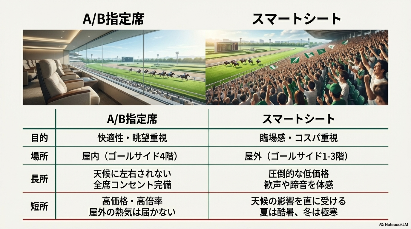 - 選べる3つの観戦エリア スマートシートは、位置によってA・B・Cの3つのエリアに区分されています。Aエリアはゴール板の正面で、白熱のゴール前攻防を見たい方に最適です。Bエリアは大型ターフビジョンの正面に位置し、レース全体の展開をビジョンで追いながら、目の前も馬が通過するという実用的な観戦が可能です。Cエリアはゴール板を過ぎた位置になりますが、レース後の競走馬が引き揚げてくる場所や、ウィナーズサークル(表彰式を行う場所)に近いという利点があります。