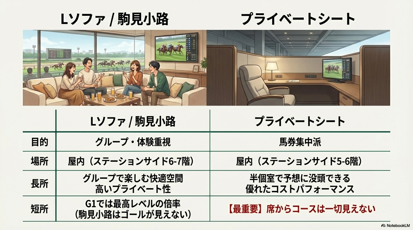 ゴール前の眺望よりも、天候に左右されない快適な環境で、電源と机を使ってじっくりと馬券検討に集中し、他場のレースも含めて一日中競馬を楽しみたいという、いわゆる「馬券派」の玄人ファンにとって、これ以上ないほどコストパフォーマンスに優れた最適な席と言えるでしょう。