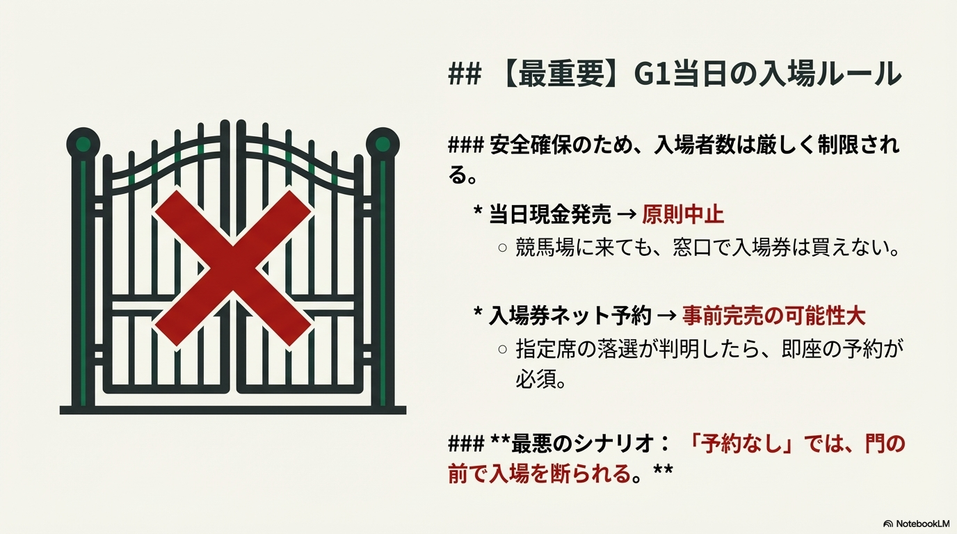 - ただしG1当日は、安全確保のため「入場券の当日現金発売」が中止され、事前の「入場券ネット予約」が必須となる可能性が非常に高い