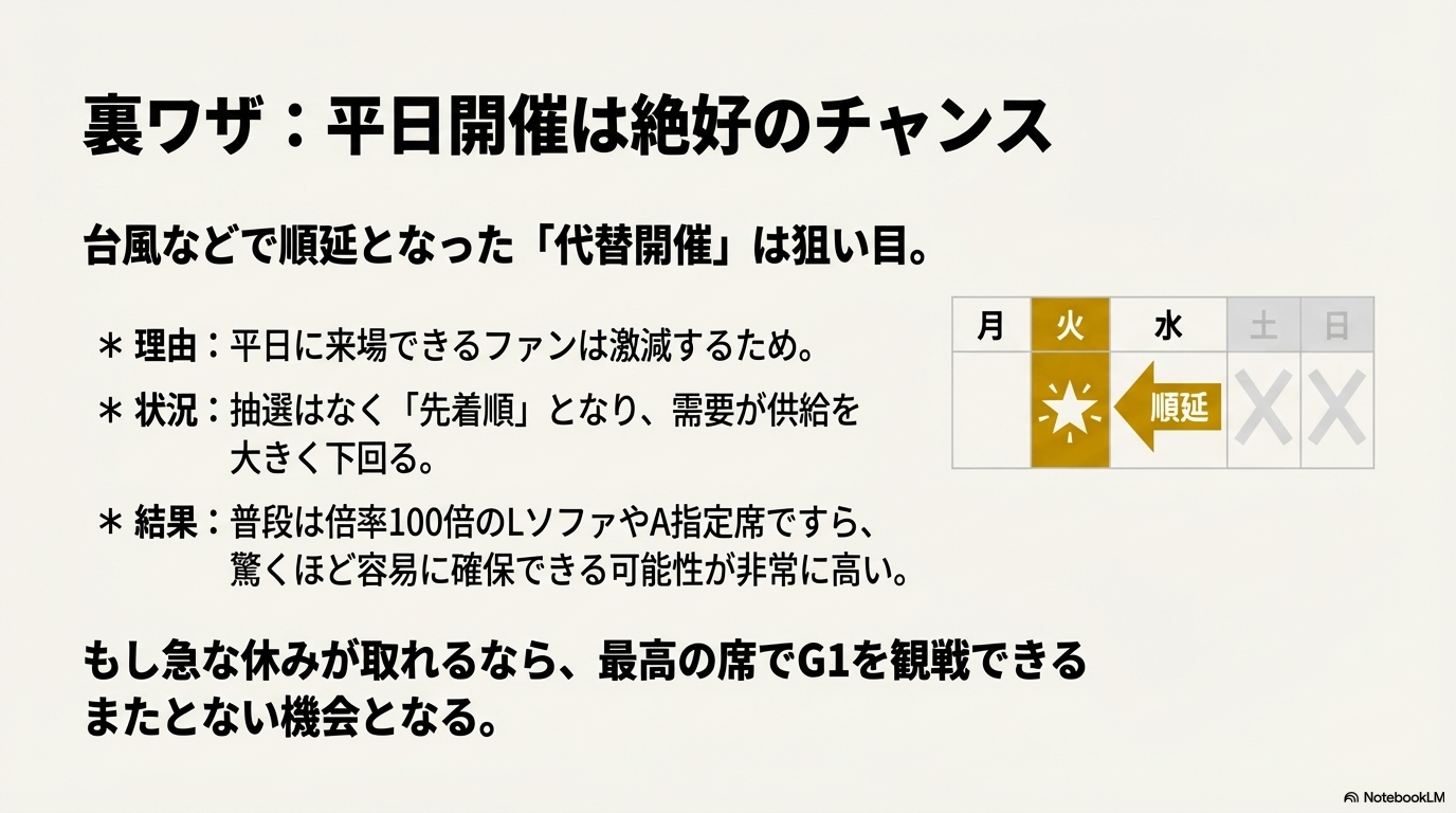 もし平日に急遽休みを取ることが可能であれば、G1レースを最高の席で観戦できる、またとない「穴場」的な機会となるかもしれません。