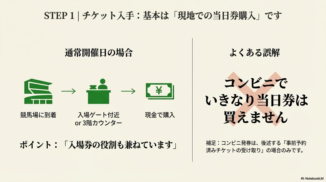 このシステムが稼働する日の最も重要なルールは、「原則として当日の現地販売は行われない」ということです(※事前販売で売れ残りがあった場合のみ、当日発売されることがありますが、それに賭けるのはあまりにハイリスクです)。つまり、「とりあえず現地に行けばなんとかなるだろう」という考えは、ビッグレースの日には通用しないと肝に銘じておきましょう。