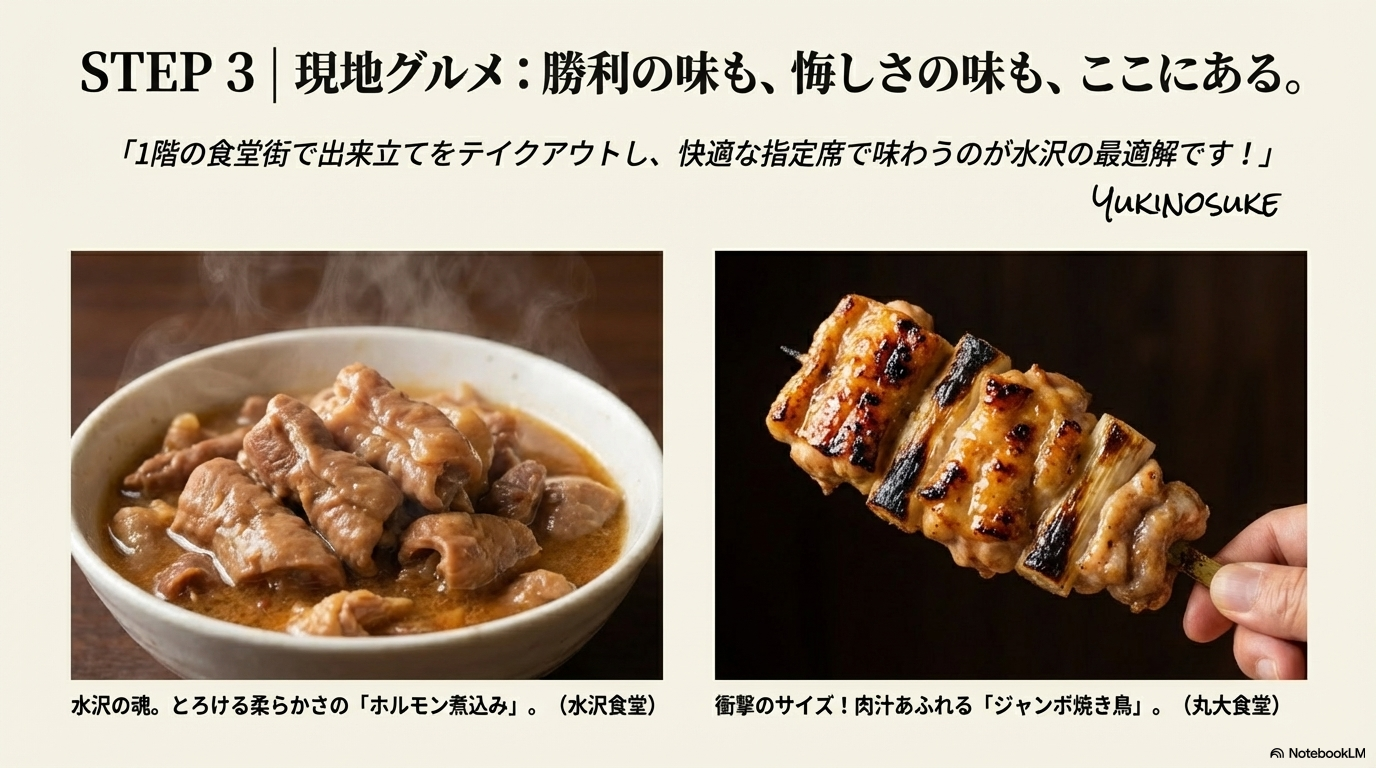 外は極寒、中は常夏。脱ぎ着しやすい服装で体温調節を制する者が、冬の水沢を制します。 - グルメは「持ち込みスタイル」: