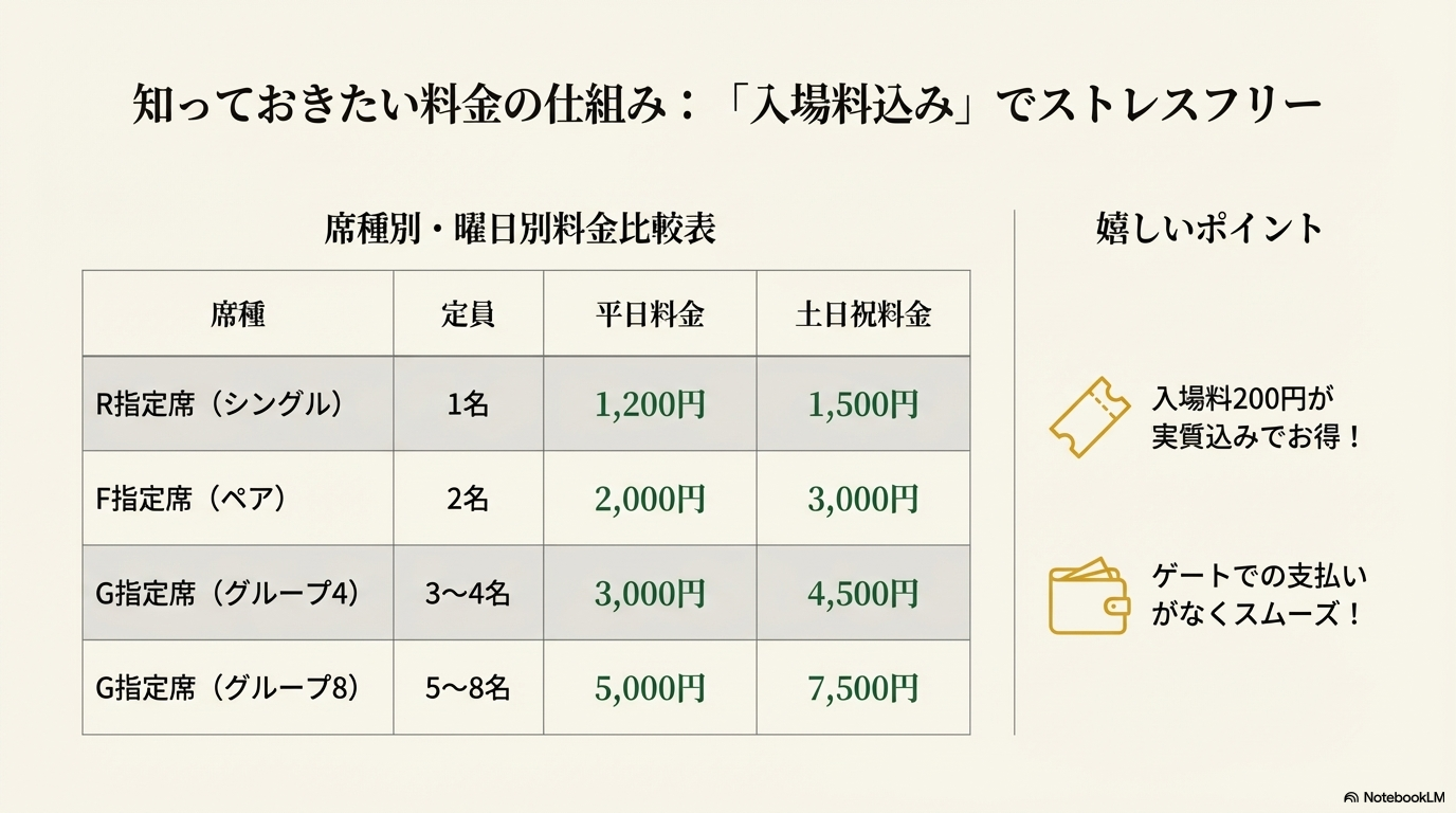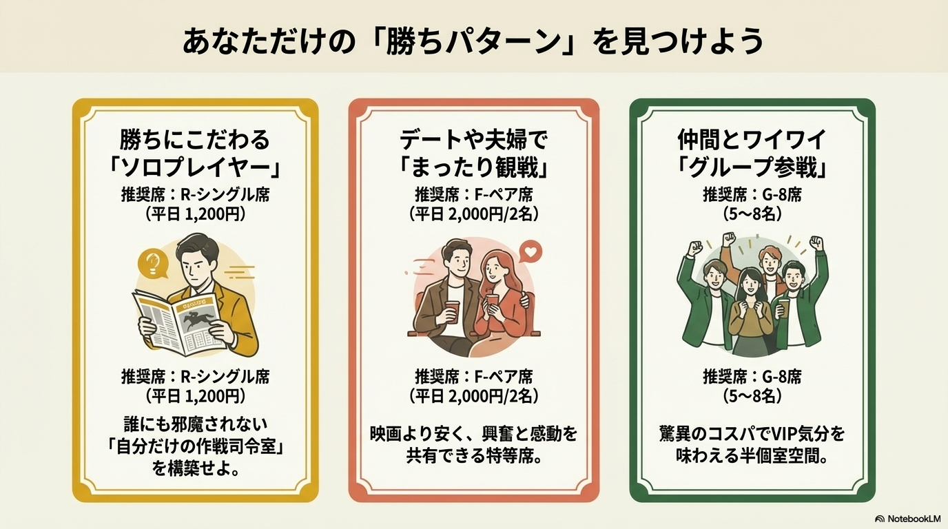 平日の「R-シングル席(1,200円)」一択です。入場料込みでこの価格は破格。コンセントと机を確保し、誰にも邪魔されずに予想に没頭できる「自分だけのオフィス」を構築しましょう。 - デートや夫婦での「まったり観戦」なら: