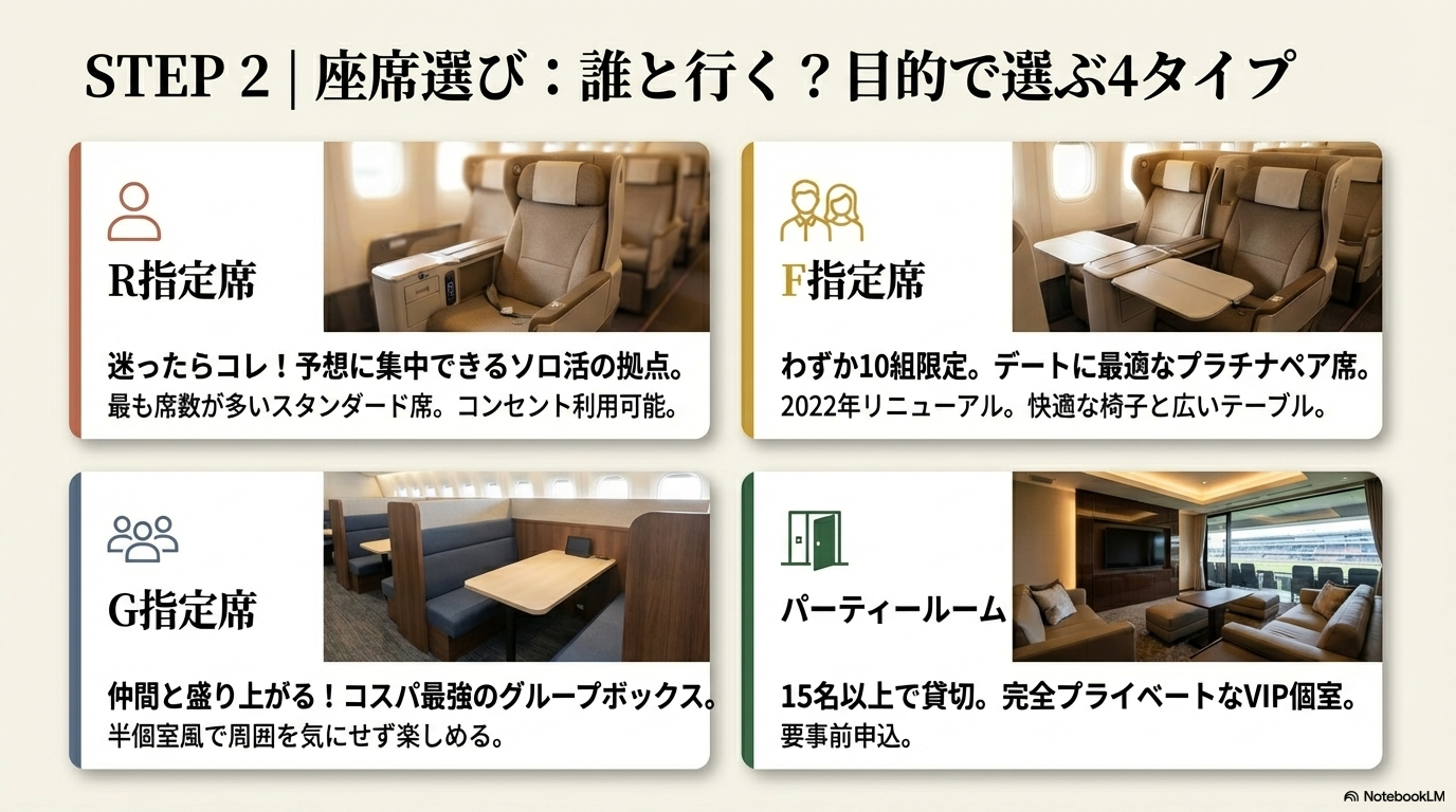 平日なら「F-ペア席(2,000円)」を狙ってください。1人あたり1,000円で、リニューアルされた綺麗な席と眺望が手に入ります。映画館に行くより安く、興奮と感動を共有できます。 - 仲間とワイワイ「グループ参戦」なら: