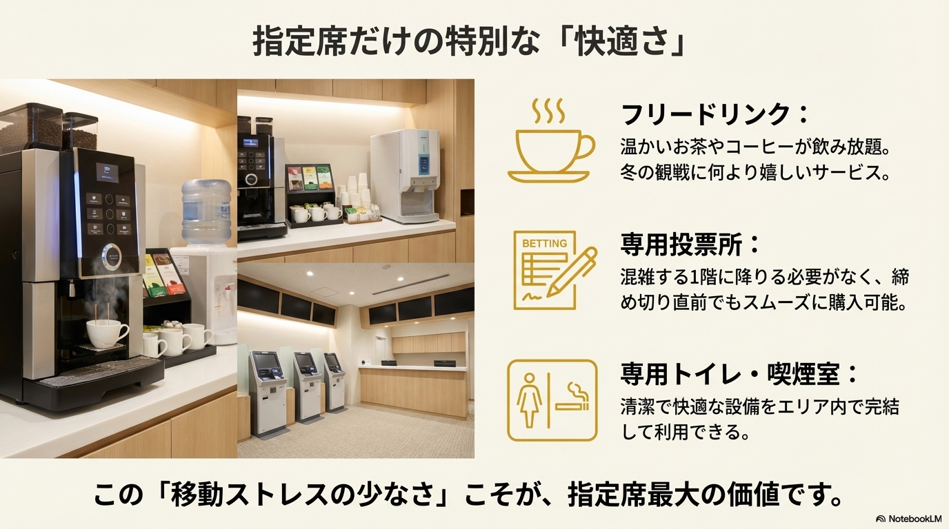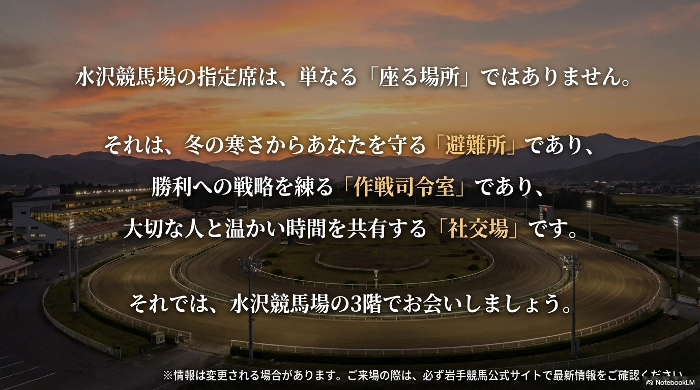 水沢競馬場の指定席は、単なる「座る場所」ではありません。それは、奥州の厳しい冬風から私たちを守ってくれる「避難所」であり、データと向き合い戦略を練る「作戦司令室」であり、そして友人や家族と温かい時間を共有する「社交場」でもあります。