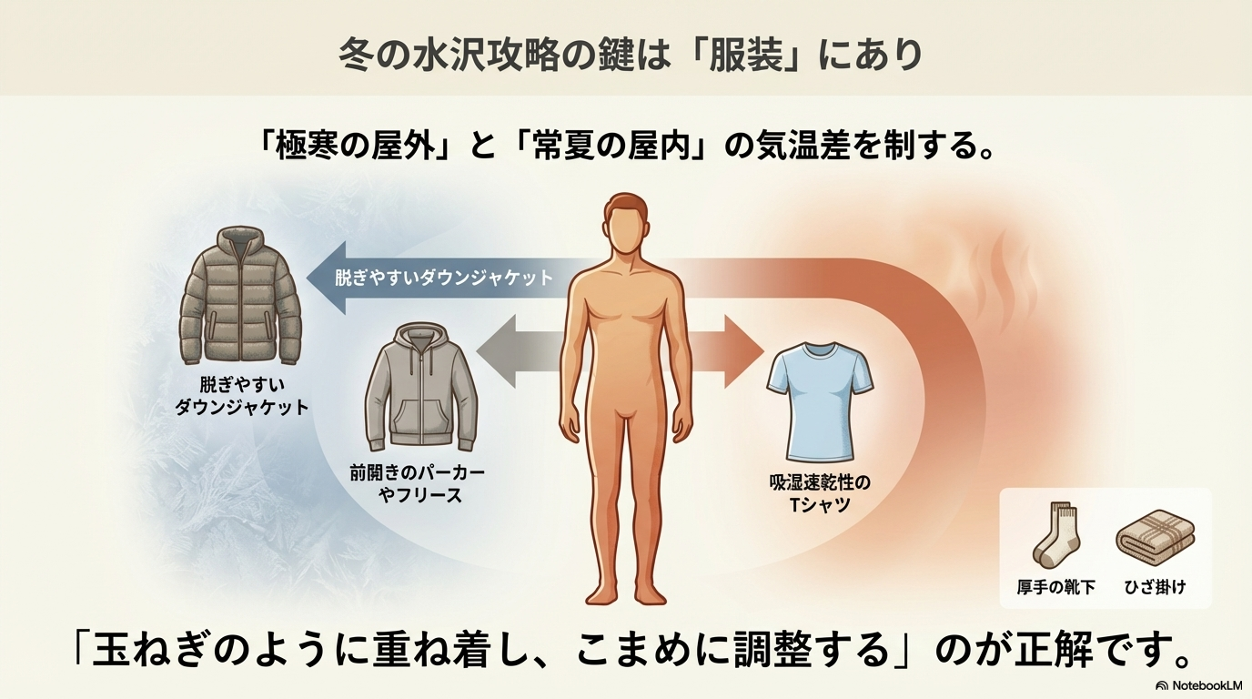 だからこそ、水沢の指定席観戦における服装選びの最大のテーマは、「極寒の屋外」と「常夏の屋内」の気温差(ヒートショック)をどう攻略するかにあります。