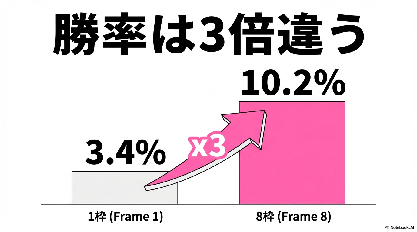 | 8枠 | 10.2% | 28.1% | 黄金枠。加速・視界ともに最高 |