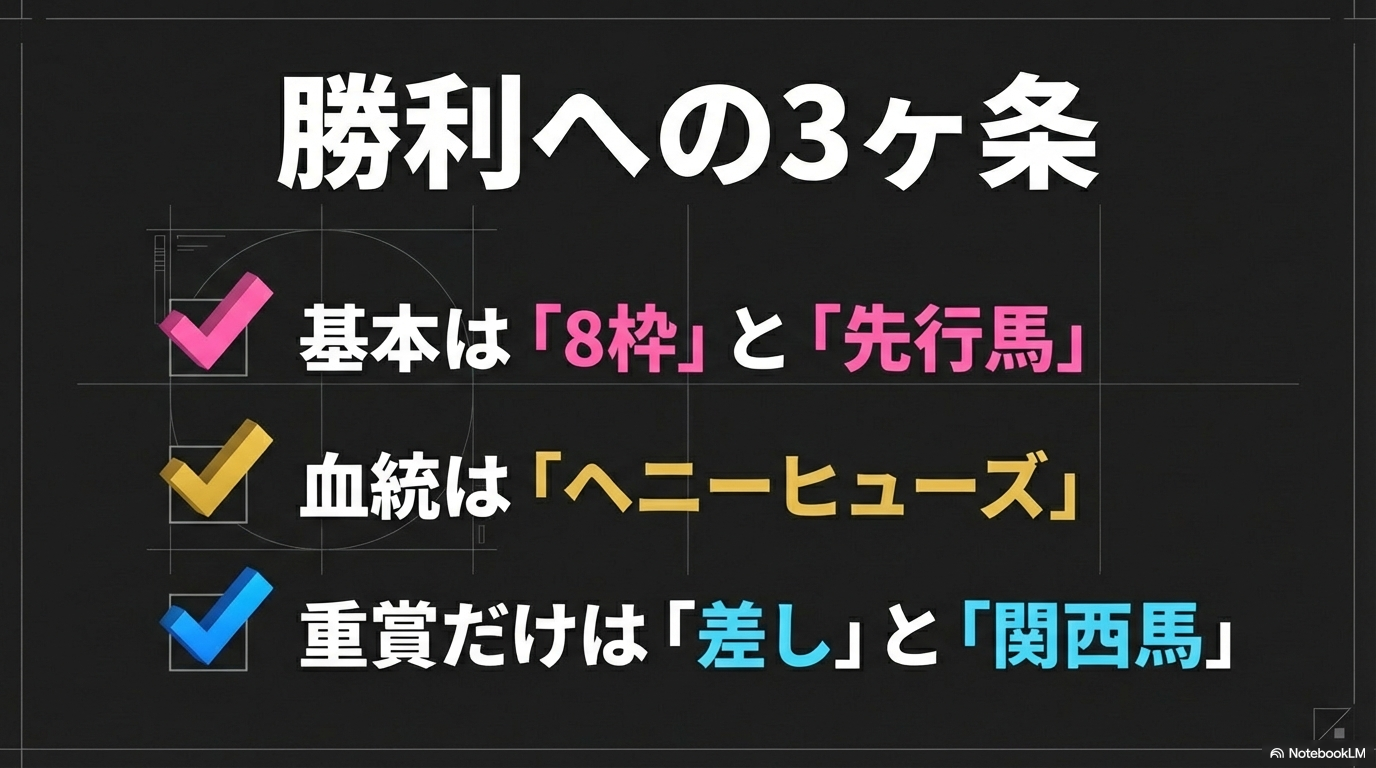 - 馬場状態によるシフト: 冬のパサパサ馬場では「パワー重視の外枠」ですが、湿った脚抜きの良い馬場なら「内枠の粘り込み」へ意識を切り替えましょう。