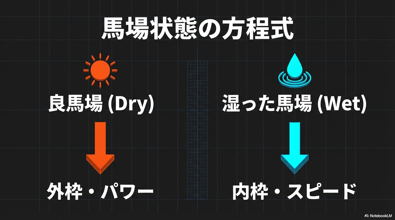 | 不良 | 高い(20%前後〜) | 水が浮く状態。スピード性能が最優先され、前に行った馬が止まらない高速決着。 |