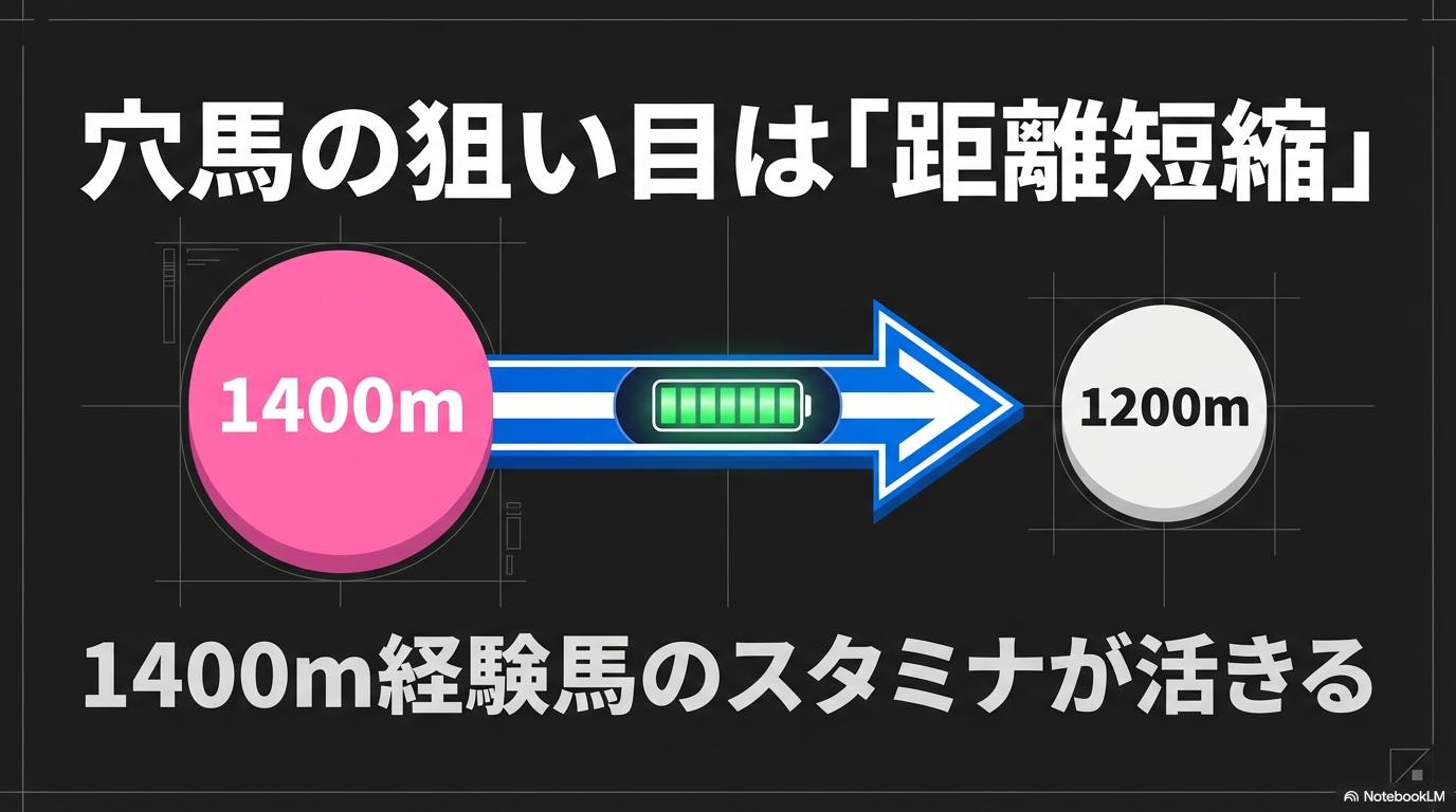 - 距離短縮×縦長展開: 前走1400m以上で負けて距離短縮してきた馬は、スタミナ豊富です。ハイペースで先行勢が総崩れになる展開なら、外枠の先行馬より期待値が高くなります。