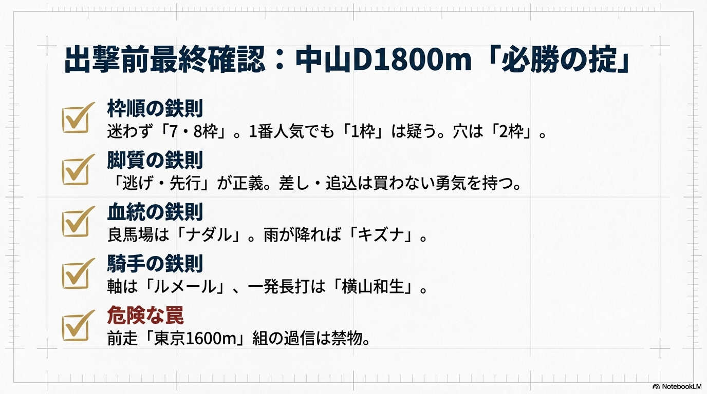 「外枠有利」を基本線にしつつ、「2枠の穴」を拾えるようになれば、あなたの中山ダート1800m攻略レベルは格段に向上するはずです。