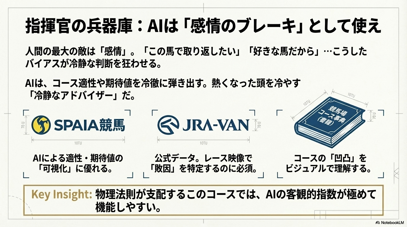 特に中山ダート1800mのような、物理法則(外枠有利・先行有利)が支配するコースでは、AIの客観的な指数が非常に機能しやすいのです。AIを「予言者」として崇めるのではなく、自分の熱くなった頭を冷やしてくれる「冷静なアドバイザー」として活用するのが、賢い付き合い方だと言えるでしょう。