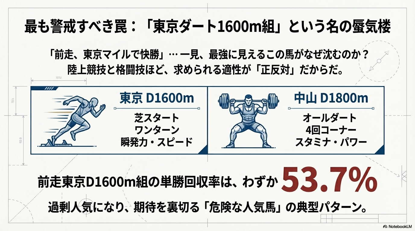 あるデータ分析によると、「前走東京ダート1600m ⇒ 今回中山ダート1800m」というローテーションの単勝回収率は、なんと53.7%しかありません。さらに驚くべきことに、前走で3着以内に好走していた馬に限っても、回収率は54.8%と低迷しています。(参考データ:[1]、[1])