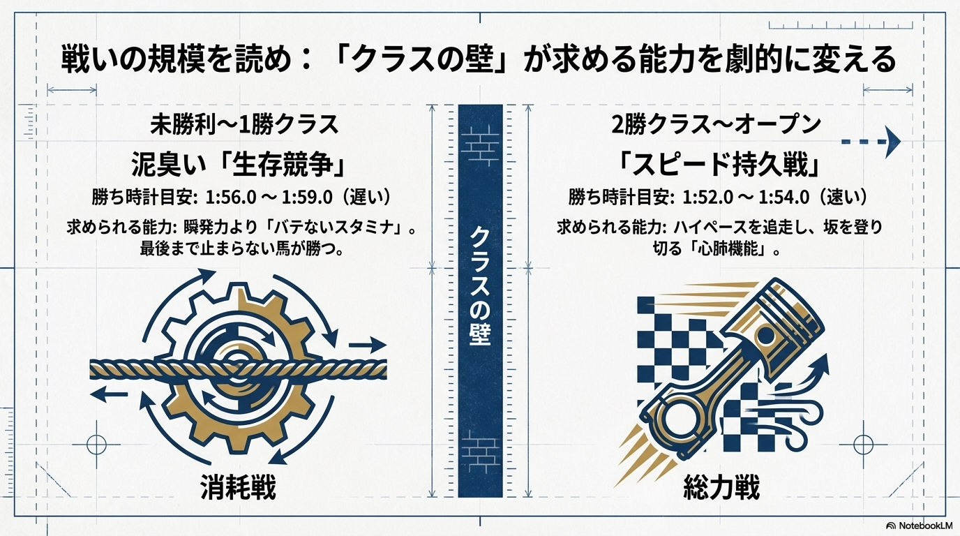 この2つのコースは、同じダート競走でありながら、求められる適性が「正反対」と言っても過言ではありません。まるで「陸上競技」と「格闘技」くらい種目が違うのです。