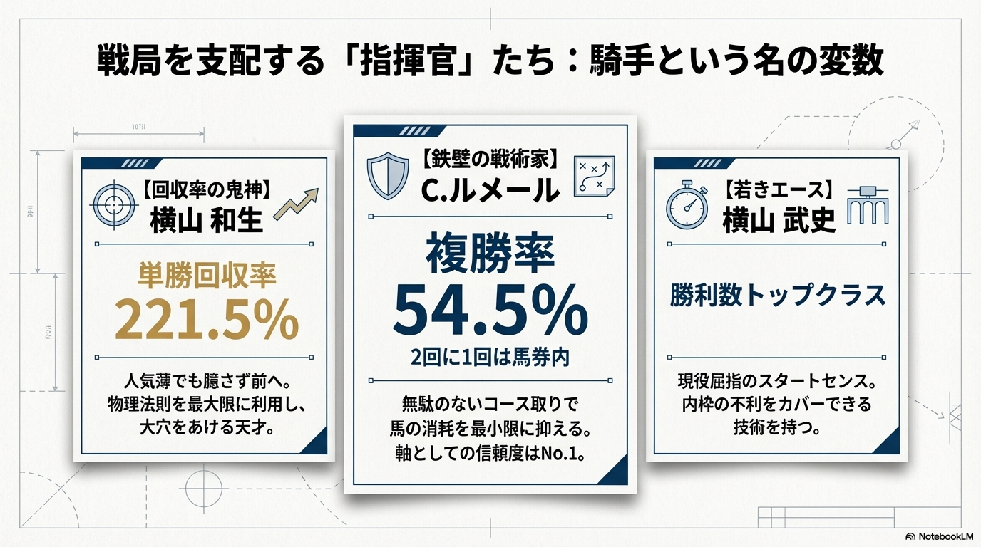 | 横山和生 | 全成績 | 221.5% | 人気に関係なく、強気に前へ運ぶアグレッシブな騎乗。 |