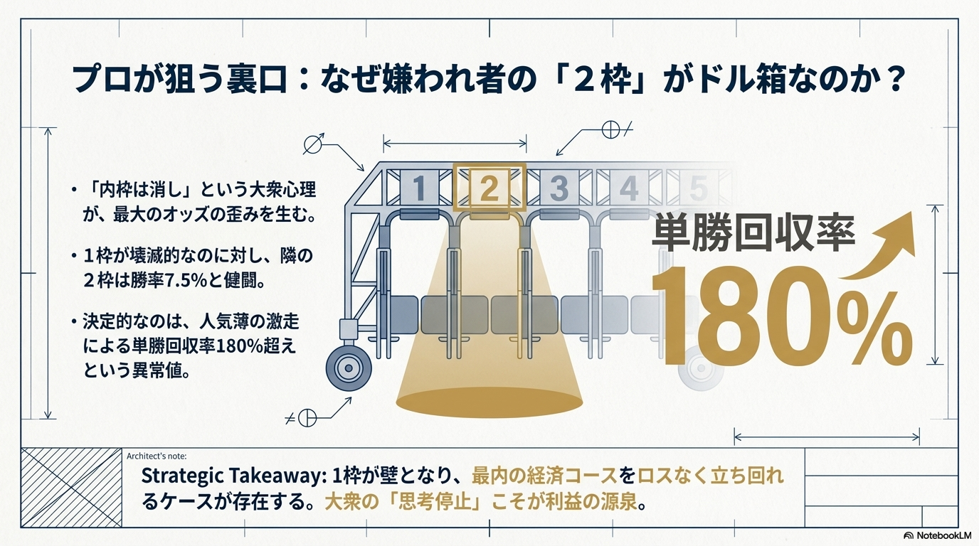 | 3~5枠 | 4~6%台 | 17~21% | 【平均〜不利】 中途半端に挟まれるリスクがあり、強調材料に欠ける。 |