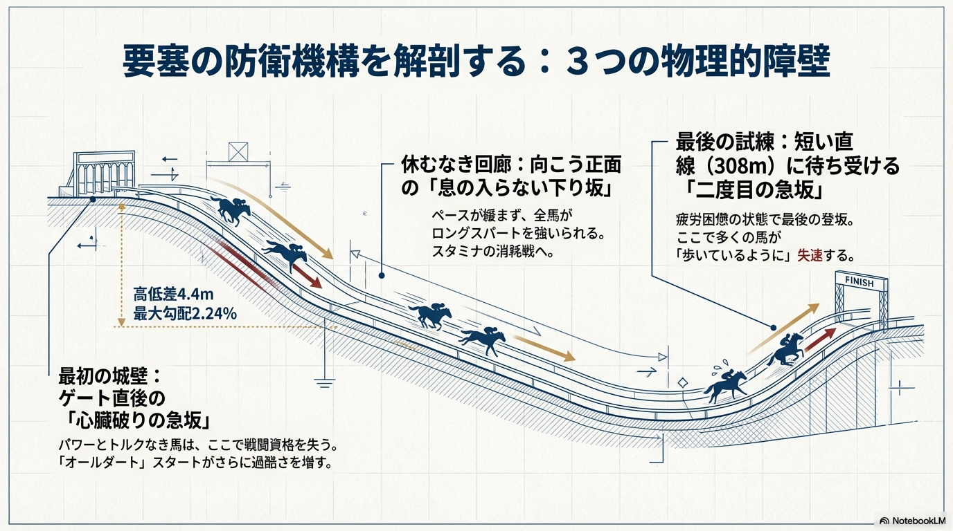競走馬にとって、レースの序盤というのはポジション争いのために最も加速したい局面ですよね。そのタイミングで強制的にこの急坂を登らされるわけですから、馬にかかる負荷は平坦コースの比ではありません。ここで出遅れたり、加速に手間取って余計な脚を使わされると、後半に残すべきスタミナがごっそりと削り取られてしまうのです。