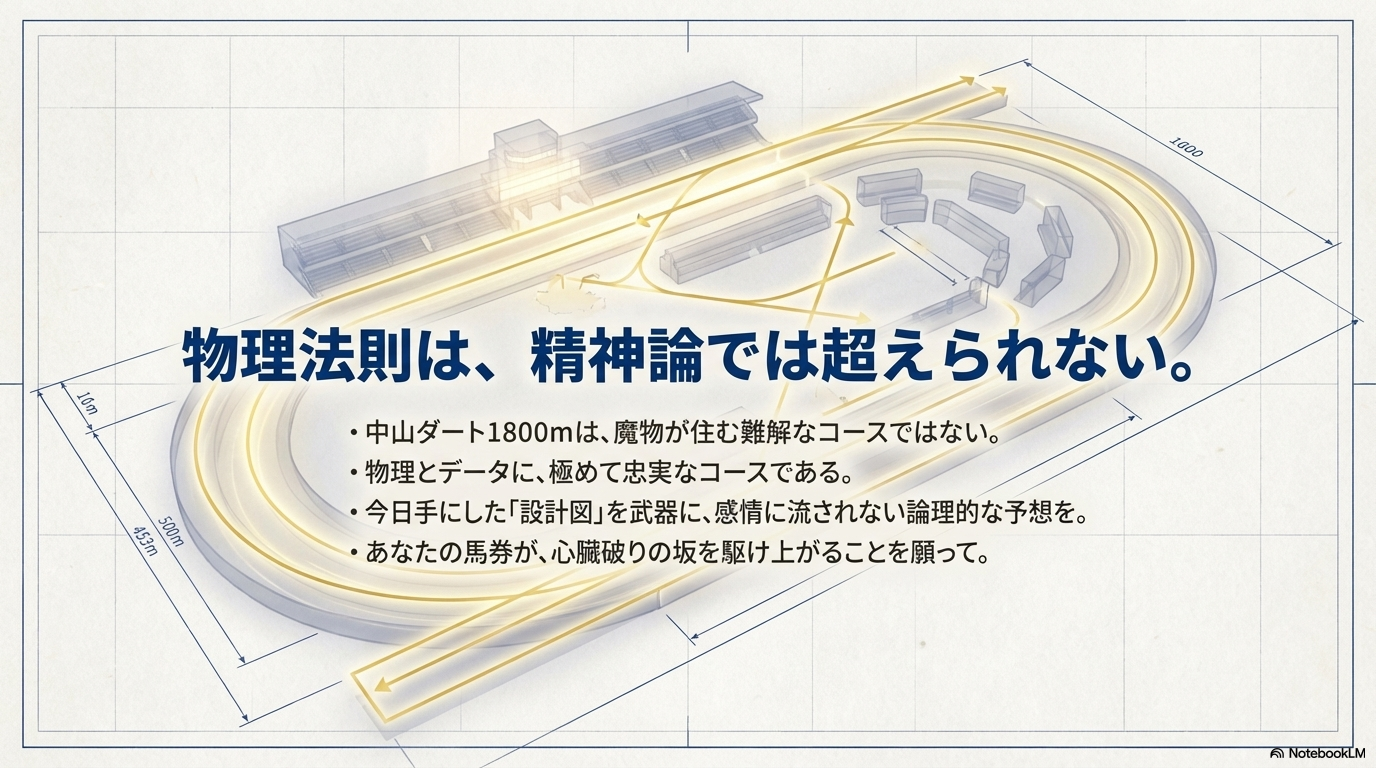 中山競馬場ダート1800mというコースは、一見すると「難解で荒れやすい」「魔物が住む」コースに見えるかもしれません。しかし、今回徹底的にデータを紐解いてきた通り、その実態は「物理法則と適性に極めて忠実なコース」です。