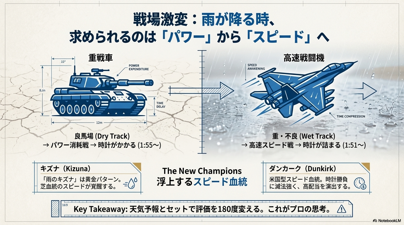 良馬場なら「ナダル・ドレフォン・ホッコータルマエ」のパワー血統。雨が降ったら「キズナ・ダンカーク」のスピード血統へシフトする。 - 【騎手の鉄則】