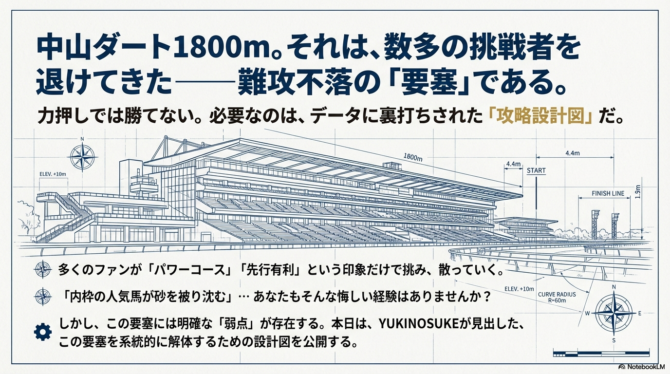 中山ダート1800mは、単なる力比べの舞台ではありません。コースの形状そのものが、出走馬に対して強烈な物理的バイアスをかけています。まずは、このコースの基礎となる「構造的な真実」を深く理解することが、的中への第一歩です。