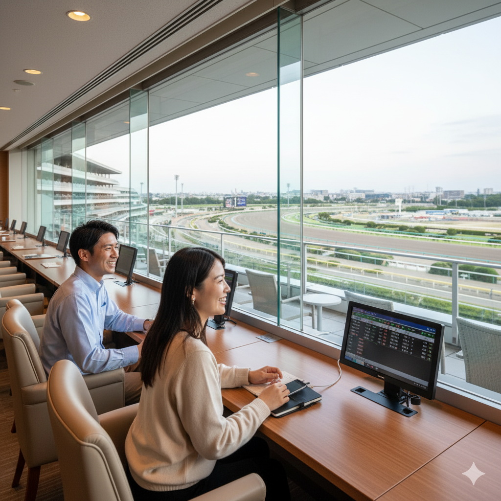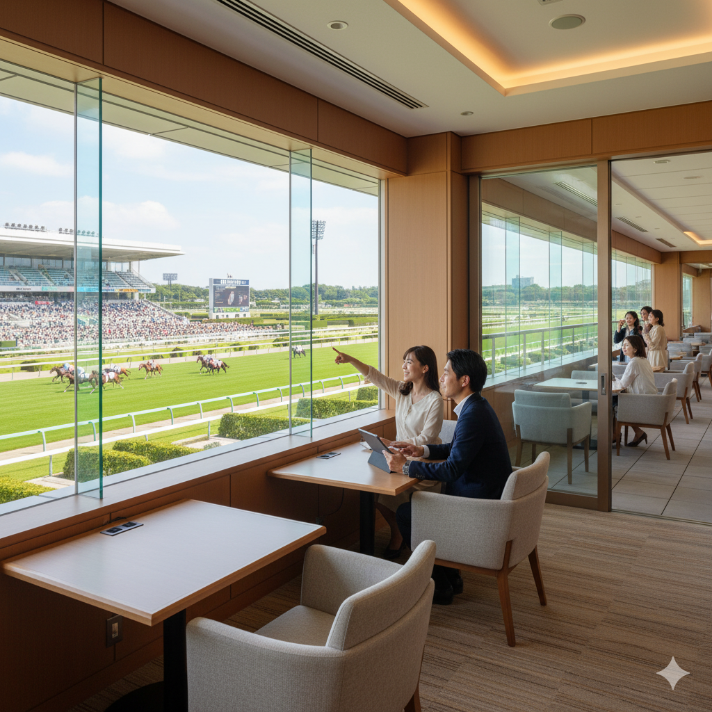 - 専用の「屋外観覧席」(席番指定) G-Seatの真価は、屋内席とは別に、席番が指定された専用の屋外観覧席も利用できる点にあります。 パドックやオッズの確認は快適な屋内で行い、レースが近づけば屋外席へ出て、最上階からコース全体を見下ろすパノラマビューと共に、生の歓声や馬の蹄音(ていおん)を肌で感じることができます。この「快適な分析」と「生の臨場感」を両立できるのが、G-Seatだけの特権です。