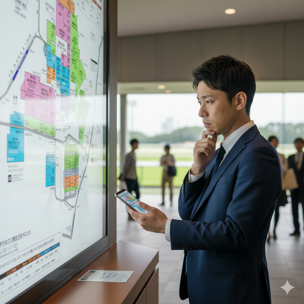 中山競馬場での競馬観戦を計画する際、快適な指定席の利用は非常に魅力的です。しかし、いざ中山競馬場の指定席マップを広げてみても、G-Seat、V-Seat、A-Seat、スマートシートなど席種が非常に多く、どの席を選べば良いか迷ってしまう方も多いのではないでしょうか。