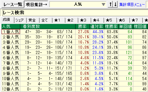 - 今回1~3人気に絞ると⇒勝率62%・連対率・複勝率87% 単回295 複回収143
