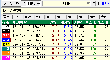 - 4回コーナーを回るため、先行馬有利の傾向。
