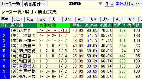 - 武井、手塚、鹿戸厩舎の成績が優秀。