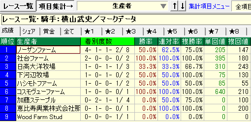 - この3厩舎で生産者ノーザンファームに絞ると⇒勝率50%・連対率62%・複勝率75% 単回205 複回収147