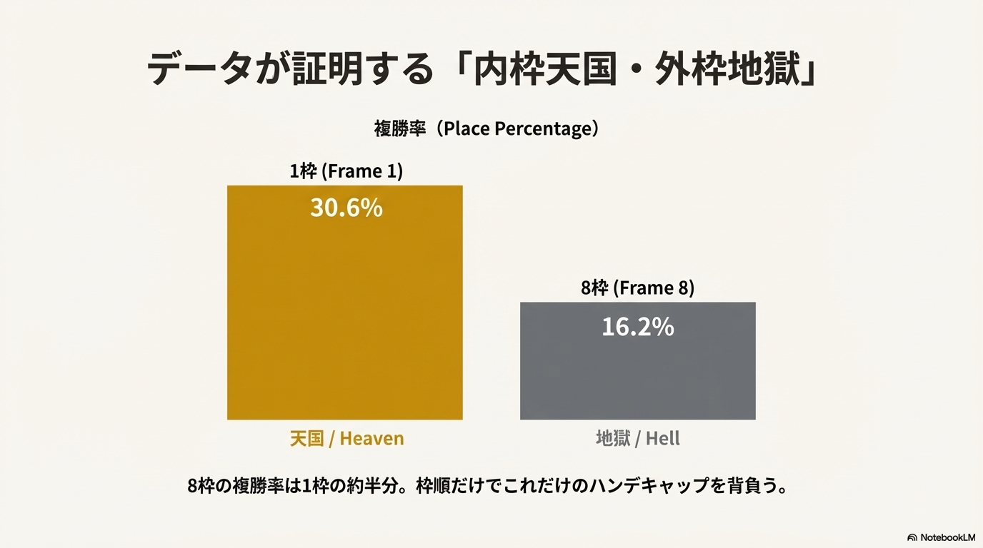| 8枠 | 約4.2% | 約16.2% | 距離ロスが最大。人気馬でも割引が必要な鬼門。 |