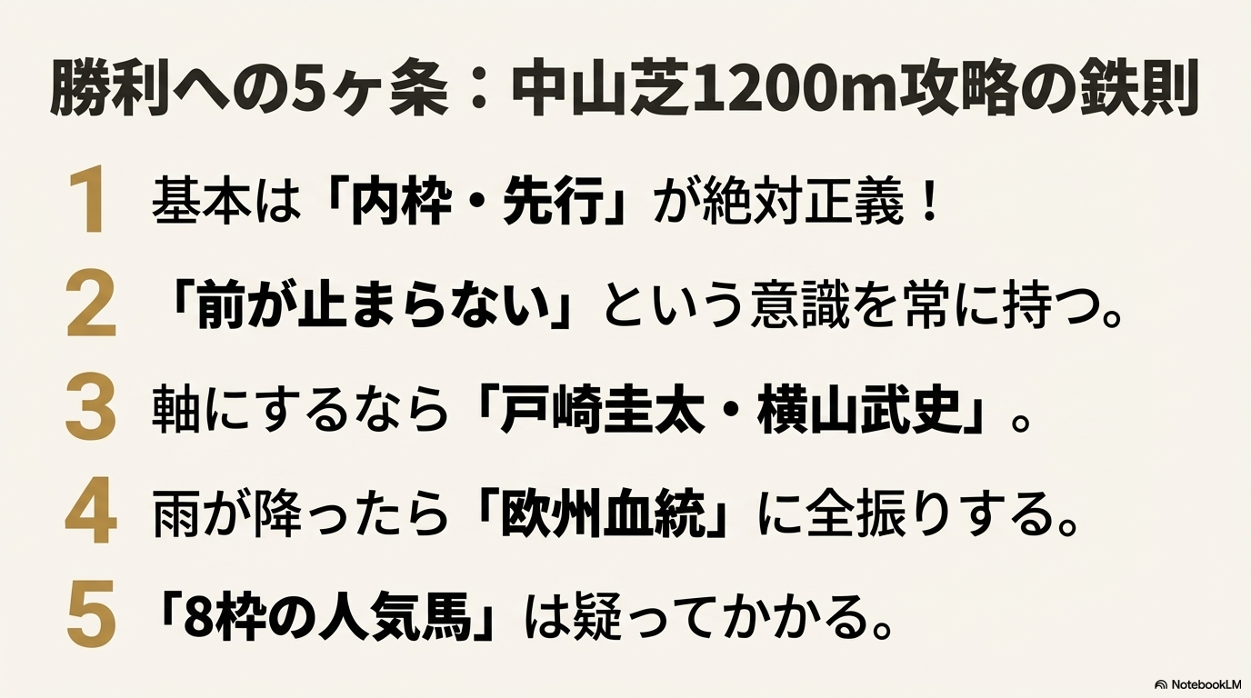 データや傾向を知らずに挑むのは、地図を持たずに樹海に入るようなもの。逆に言えば、正しい羅針盤さえ持っていれば、他のファンが「なんとなく」で買っている馬券を横目に、根拠のある一撃を狙い撃つことができるのです。最後に、明日からの予想で迷わないために、絶対に脳裏に焼き付けておいてほしい「YUKINOSUKE流・攻略の5ヶ条」をまとめました。