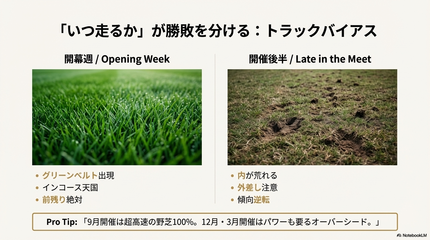 - 季節ごとのバイアスにも言及:単なる通算データだけでなく、開催時期による傾向の違いにも触れられているため、より実戦的な予想が可能です。