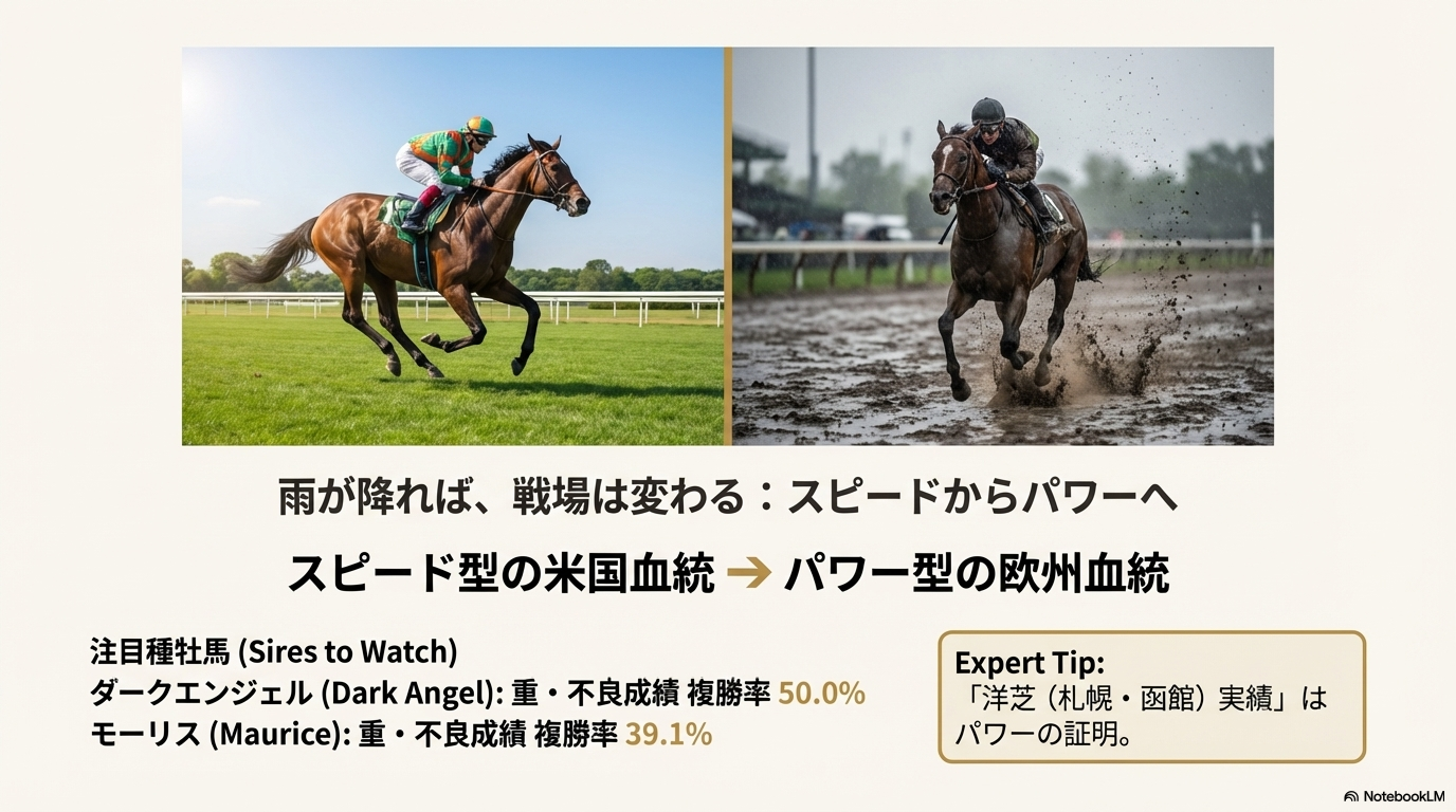 具体的に、馬場が悪化した際に狙うべき種牡馬のデータを分析しました。日本の主流である「サンデーサイレンス系」の瞬発力が封じられる一方で、筋肉量の多い「パワー型」の種牡馬が数値を跳ね上げます。