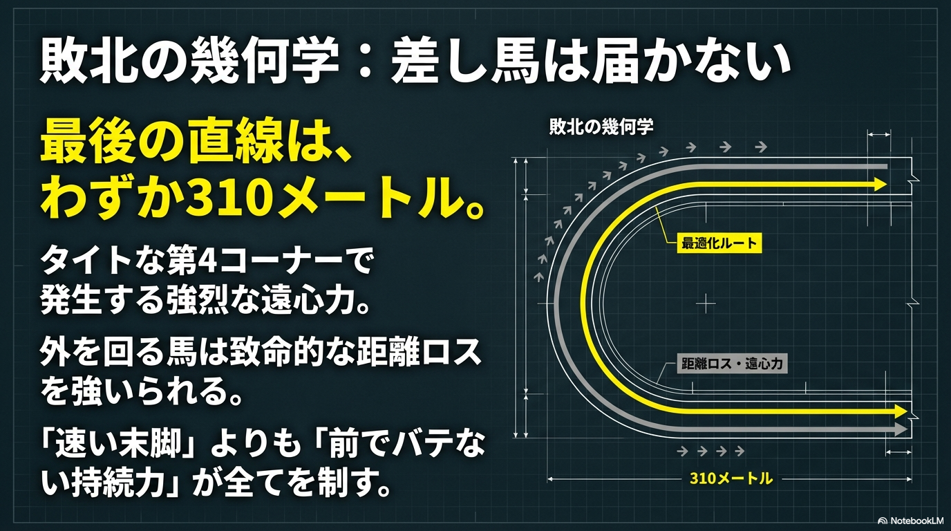 また、中山の内回りコースは最後の直線が310mしかありません。この短い直線の入り口付近には小回りでタイトな第4コーナーがあり、遠心力で外に振られやすい構造になっています。後方から差そうとする馬は、このコーナーで外を回らされる距離ロスを強いられるか、馬群を縫って内を突くギャンブルを強いられます。一方で、ロスなく前で立ち回っている馬は、最短距離で最後の坂へ向かうことができるため、能力的に多少劣る馬であっても「ポジションの差」だけで押し切れてしまうのが中山芝1800mの恐ろしさでもあり、馬券的な妙味でもあります。