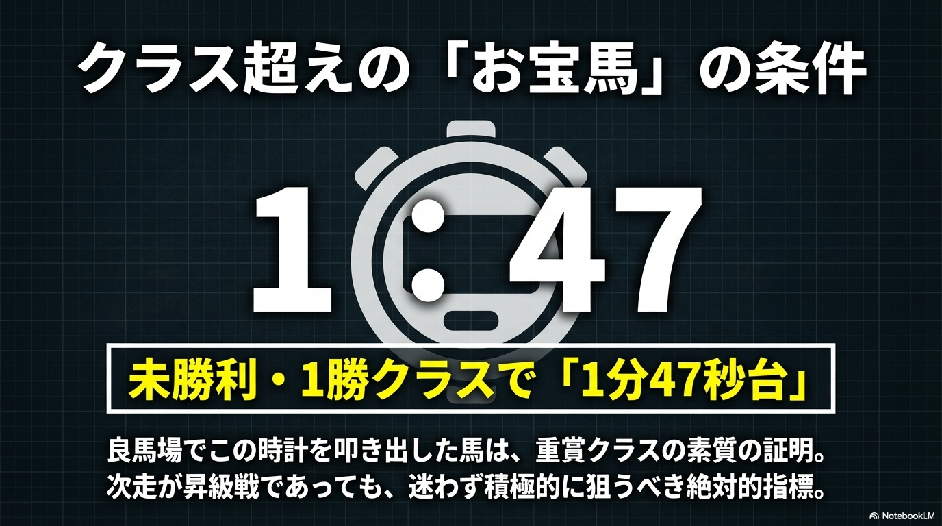 もし未勝利クラスや1勝クラスの段階で、重賞並みの「1分47秒台」を叩き出している馬がいたら、それはコース適性が極めて高い「クラス超えの素質馬」である可能性が高いです。特に当日の馬場状態が標準的な良馬場であれば、次走で昇級初戦であっても積極的に狙っていくべき「お宝馬」になりますよ。