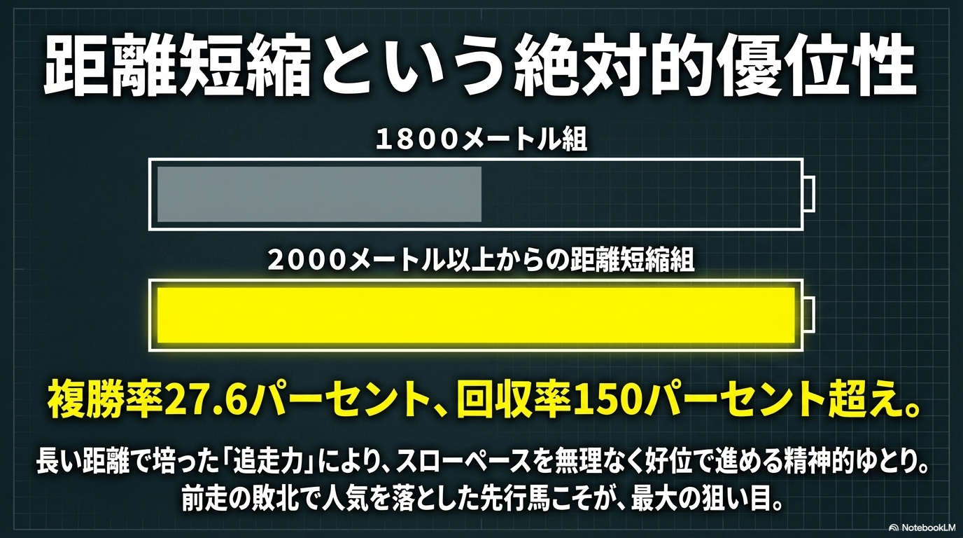 | 距離短縮組 | 27.6% | 70% | 馬券戦略の核。複勝回収率が優秀。 |