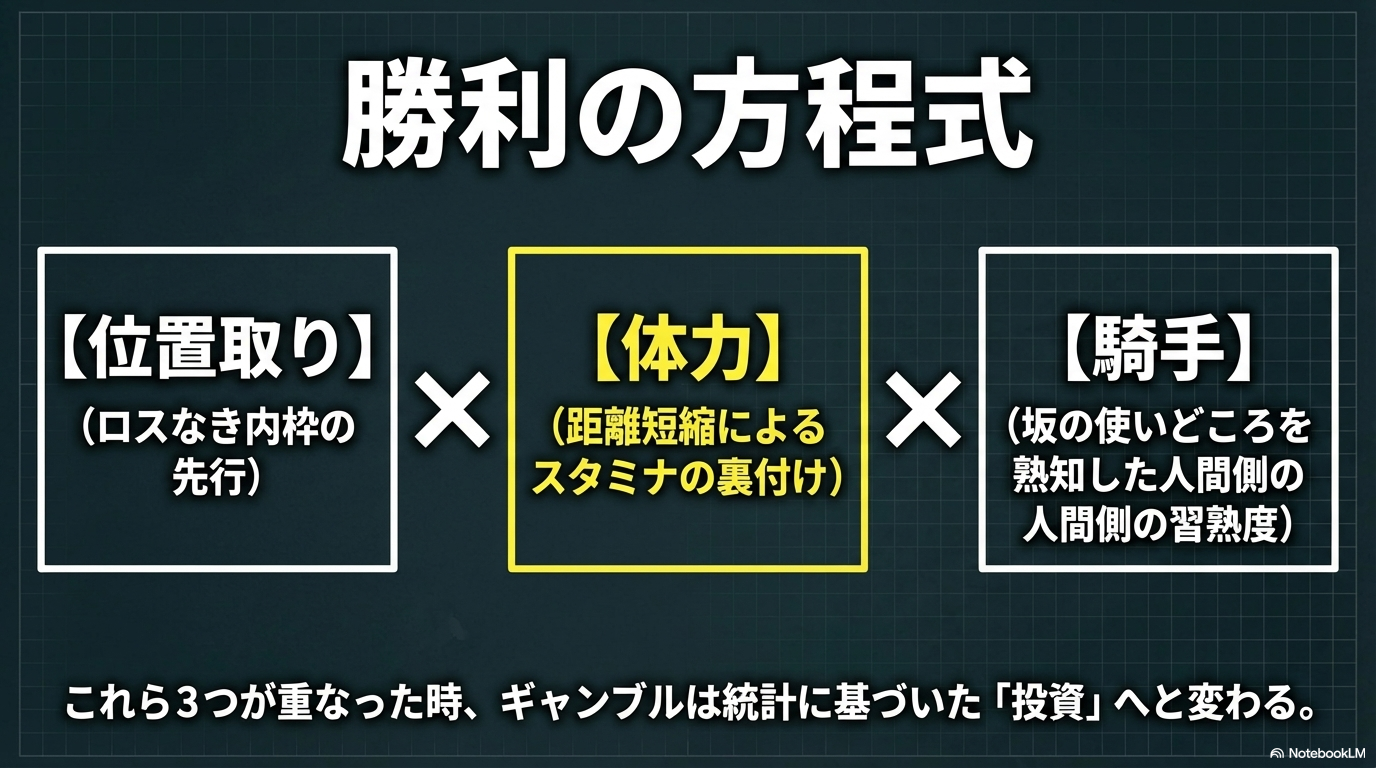 | 距離の貯金 | 前走2000m以上を使っていて、今回1〜3枠を引いているか | 坂での粘り強さと経済コースの利を両立 |