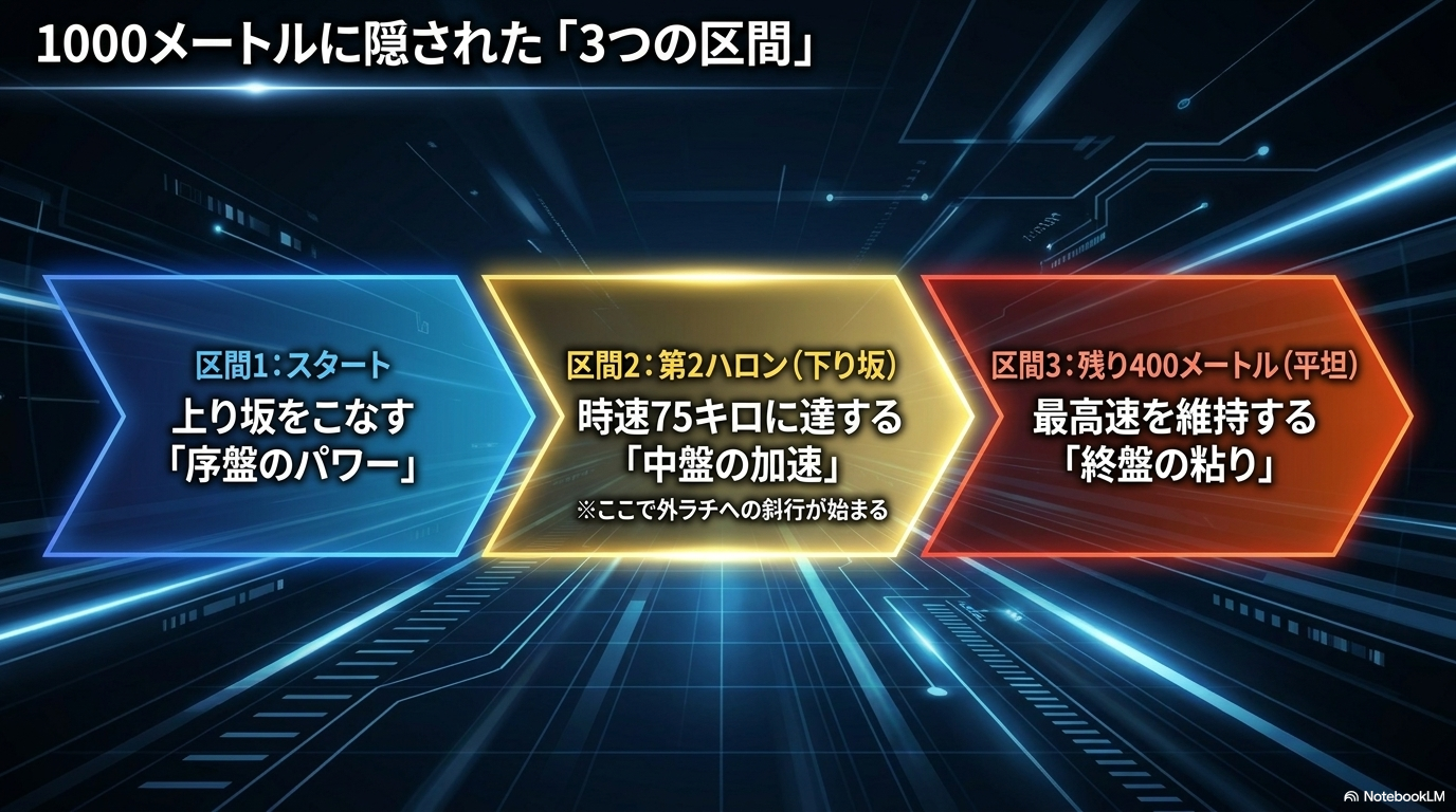 ここで脚を使いすぎると、ラスト1ハロンで無惨に失速してしまいます。 坂を登り切った後は、約200mにわたる下り坂に転じます。ここがレースの質を決定づける「第2ハロン」です。重力による加速も加わり、馬たちのスピードは時速75km前後の極限域に達します。この区間で隊列がほぼ決まり、多くの馬が有利な外ラチ沿いを目指して斜行を開始します。そしてラスト400m(残り2ハロン弱)は完全に平坦な直線となり、ここでは「いかに最高速を維持できるか」という持続力の勝負へと移行します。まさに、序盤のパワー、中盤の加速、終盤の粘りという、三段階の能力が問われる構造になっているのです。