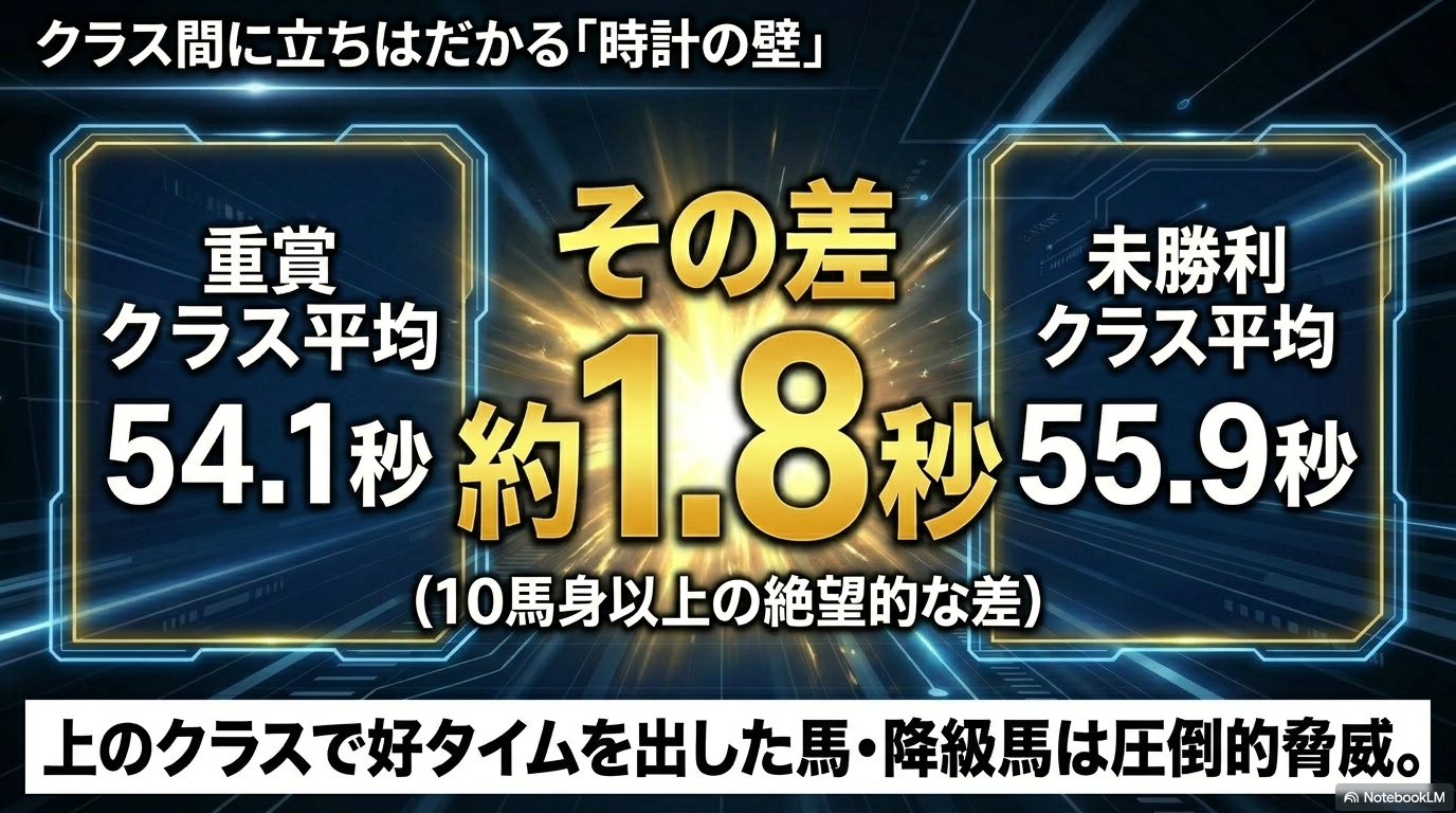 私自身、予想の際はまず出走各馬の持ち時計をクラスの平均タイムと照らし合わせることから始めています。 過去10年のデータを精査すると、クラスごとに明確な「時計の壁」が存在することが分かります。例えば、最高峰の重賞クラス(アイビスSD)の平均勝ちタイムは54.1秒前後ですが、3歳未勝利戦では55.9秒と、約1.8秒もの開きがあります。この差は距離に換算すると10馬身以上に相当するため、格上のレースから降りてきた馬や、上のクラスで好タイムを記録している馬がいれば、それだけで圧倒的な脅威となりますね。